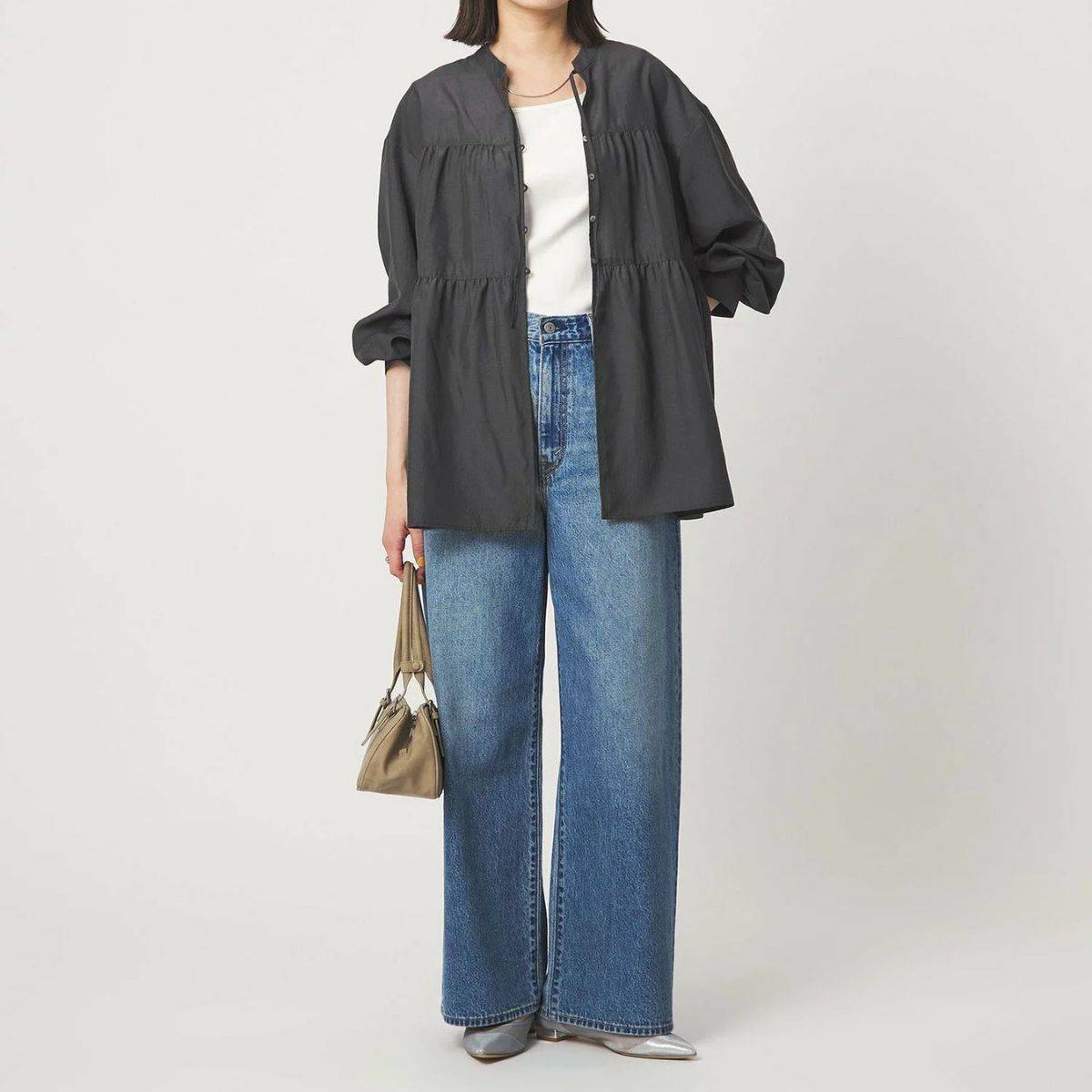 体型を拾いにくいシルエットと長めの丈感で、お腹まわりやヒップを自然にカバー。バンドカラーが顔まわりをすっきり見せ、50代の大人コーデにもなじみますよ。
